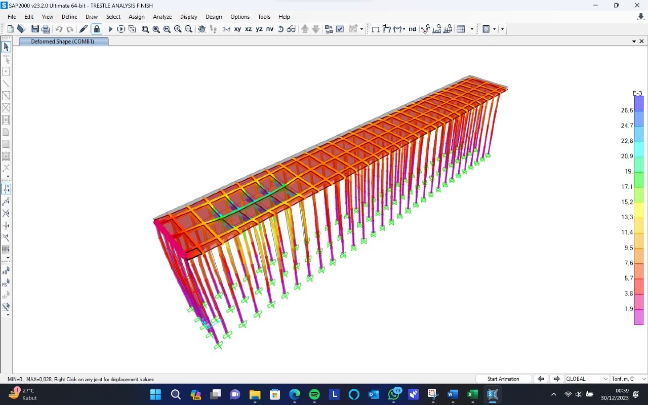 Setelah dilakukan simulasi dan pembebanan, maka akan didapatkan informasi hasil analisis tersebut seperti nilai deformasi yaitu displacement atau perubahan bentuk dermaga sebagai respons terhadap beban yang diterapkan. Informasi tentang deformasi membantu untuk memahami tingkat fleksibilitas dan kekakuan dermaga. Berikutnya adalah tegangan atau distribusi tegangan di seluruh struktur dermaga, yang memberikan wawasan tentang bagaimana tegangan dipindahkan melalui komponen struktural dan di mana titik-titik kritis mungkin terjadi. Dan terakhir adalah reaksi dan gaya yang terjadi pada titik-titik penyangga dan sambungan, yang merupakan hasil dari interaksi antara dermaga dan beban yang diterapkan.