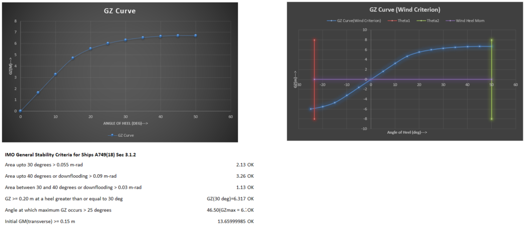 GZ (Lengan Stabilitas): Kurva stabilitas harus menunjukkan bahwa kapal memiliki righting moment yang cukup saat miring (listing) akibat swing crane.