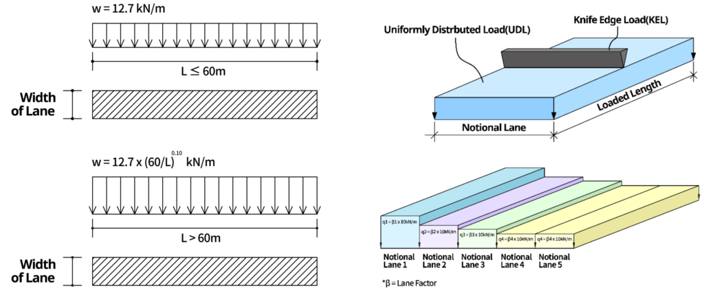 Model pengaruh satu kendaraan disebut sebagai beban truk desain (atau beban kendaraan lainnya). Meskipun bebannya lebih kecil daripada beban truk desain, pengaruh pemodelan saat kendaraan ini diangkut disebut beban lajur desain. Beban truk terutama dinyatakan sebagai beban terpusat yang bekerja pada setiap roda sementara beban lajur dinyatakan sebagai beban yang terdistribusi secara merata.