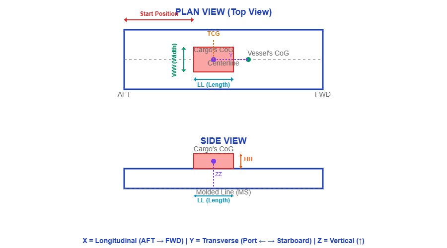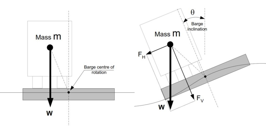 Dalam persamaan ini, XX adalah jarak horizontal kargo dari pusat roll (m). Komponen pertama mewakili gaya inersia vertikal akibat percepatan angular horizontal, sedangkan komponen kedua adalah komponen vertikal dari berat kargo yang dimodifikasi oleh gerakan heave. Faktor (1 – Hg) menunjukkan bahwa gerakan heave dapat mengurangi atau menambah beban vertikal efektif pada sistem pengikatan. Gaya vertikal ini sangat penting untuk mengevaluasi risiko uplift atau terangkatnya kargo dari deck.