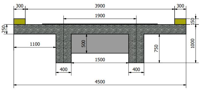 Pemodelan dan analisis struktur existing jembatan diawali dengan mengumpulkan dan mengintegrasikan seluruh data teknis yang tersedia, seperti yang tercantum dalam laporan pemeriksaan. Geometri utama struktur mengacu pada bentang sepanjang 14-meter dengan dua buah gelagar utama (nb=2) berukuran lebar 400 mm (bw) dan tinggi 1000 mm (hb), yang disusun dengan jarak antar gelagar (s) 1.5 meter. Pelat lantai jembatan memiliki tebal (ts) 250 mm dan diperkuat oleh dua barrier jalan (nbarrier=2) dengan luas penampang masing-masing 4,200,000 mm². Untuk analisis, lebar efektif pelat (bef) ditetapkan sebesar 2000 mm berdasarkan evaluasi kriteria yang berlaku. Pembebanan struktur memperhitungkan berat sendiri beton (γc = 30 kN/m³) dan lapis perkerasan aspal setebal 50 mm (γaspal = 22 kN/m³). Data-data kunci ini kemudian menjadi dasar dalam membangun model struktural untuk mengevaluasi kapasitas, kinerja, dan keamanan jembatan existing di bawah berbagai skenario pembebanan.