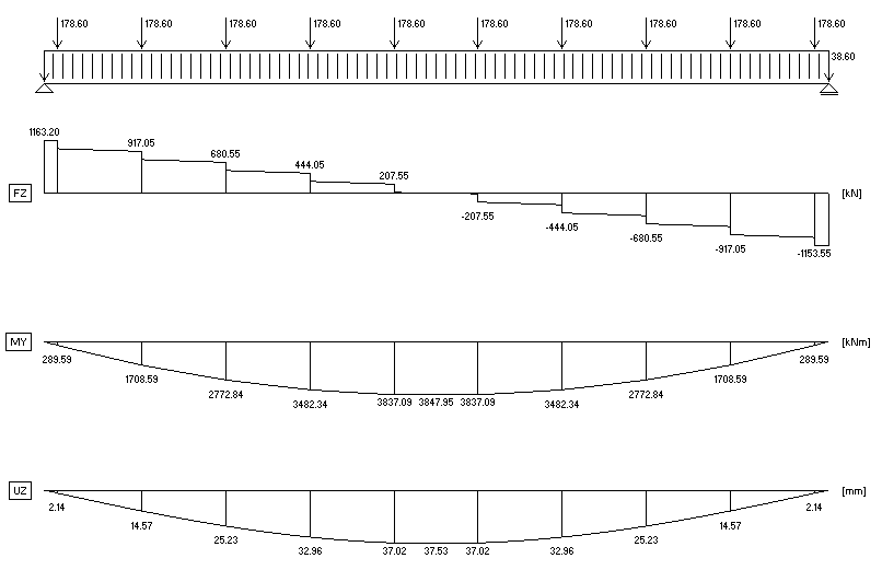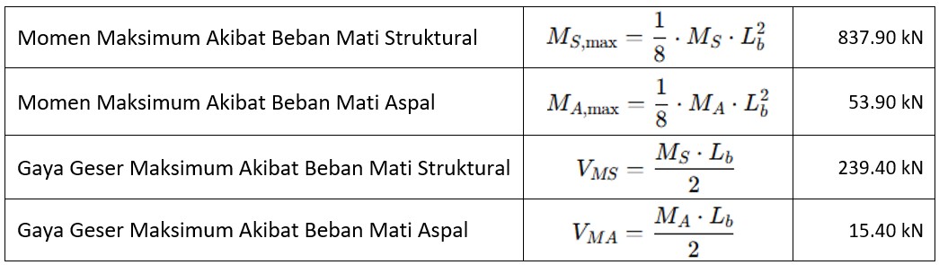 Karena beban merata, maka momen dan geser akibat beban MS dan MA di tengah bentang ditentukan dengan persamaan-persamaan berikut: