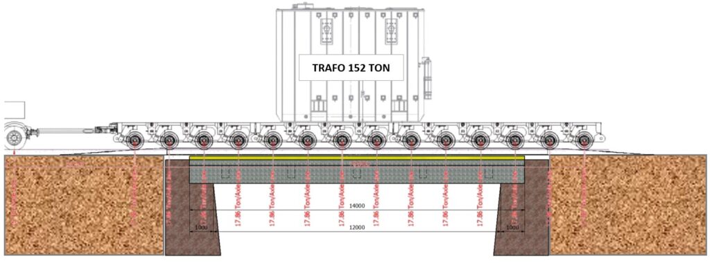 Melaksanakan kegiatan inspeksi dan evaluasi teknis terhadap kondisi struktur jembatan eksisting yang berada pada jalur pengiriman 6 (enam) unit trafo, masing-masing dengan berat 152 ton. Pemeriksaan ini mencakup peninjauan visual, pengumpulan data teknis lapangan, serta perhitungan manual terhadap kapasitas struktur, termasuk momen lentur dan gaya geser pada elemen-elemen utama jembatan.