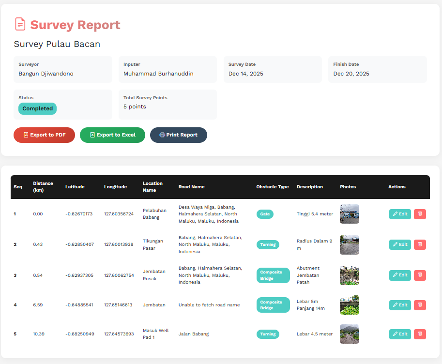 Aplikasi ini menawarkan berbagai fitur profesional yang mencakup manajemen multi-proyek, sistem role-based access control dengan tiga level pengguna (Admin, Surveyor, dan Inputer), serta kemampuan ekspor data ke format PDF dan Excel untuk keperluan pelaporan. Setiap titik survey dapat dilengkapi dengan informasi detail seperti nama lokasi, nama jalan, elevasi (otomatis atau manual), jenis hambatan, deskripsi, dan hingga dua foto dokumentasi. Fitur insert position yang cerdas memungkinkan penambahan titik survey di posisi mana pun dengan auto-renumbering otomatis, sementara sistem drag-and-drop pada peta satelit memberikan fleksibilitas penuh dalam penyesuaian GPS location secara visual. Visualisasi data elevasi ditampilkan dalam bentuk grafik interaktif dengan Chart.js yang menampilkan statistik lengkap seperti elevasi maksimum/minimum, total pendakian/penurunan, dan identifikasi kemiringan terjal untuk analisis keamanan rute.
