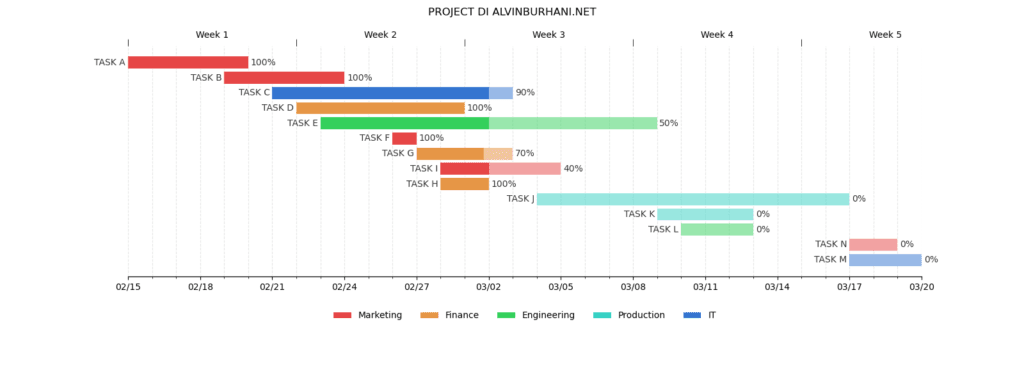 Sekarang kode kelengkapan proyek ke visualisasi dimana untuk meningkatkan presisi, persentase progress dituliskan di akhir grafik batang, dan untuk membedakan yang sudah selesai dari yang belum selesai, parameter alfa (transparensi) pada grafik juga divisualisasikan.