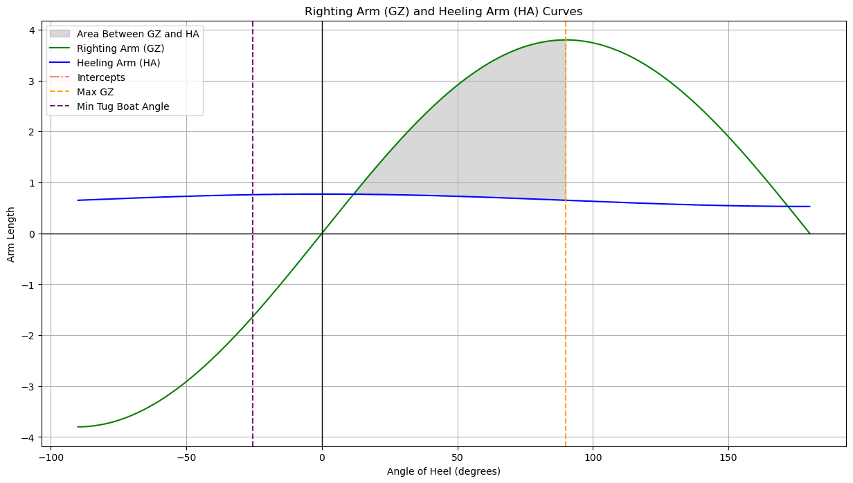 theta_values = np.arange(-90, 181, 1) # Angle of heel from -90 to 180 degrees