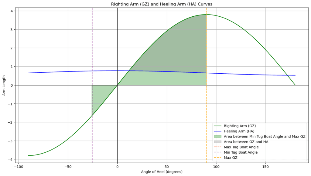 Biasanya heeling arm harus dibandingkan dengan righting arm, yaitu jarak horizontal antara pusat gravitasi dan pusat buoyancy kapal, yang menentukan stabilitas kapal. Jika heeling arm lebih besar dari righting arm, kapal bisa terbalik. Oleh karena itu, analisis stabilitas kapal tug boat sangat penting untuk menjamin operasi yang aman dan efesien.