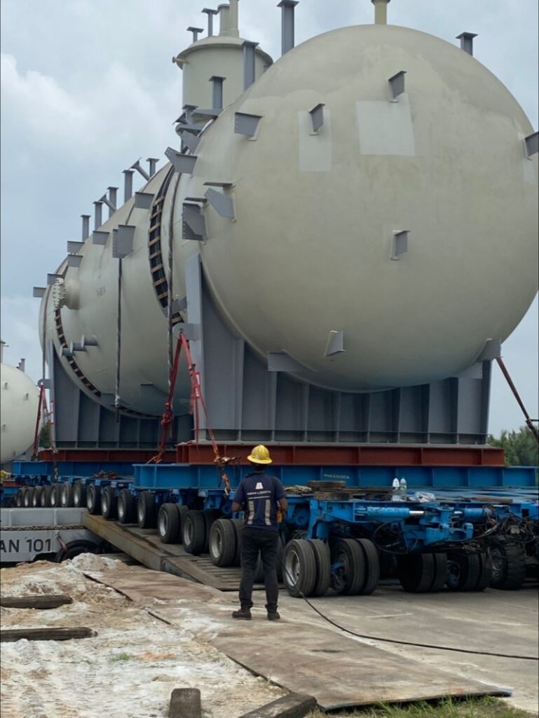 Views: 398 7 0 Read Time:2 Minute, 34 SecondLoadout merupakan proses krusial dalam proyek pengembangan infrastruktur lepas pantai, di mana struktur yang telah difabrikasi di darat dipindahkan ke atas sarana angkut seperti tongkang. Proses ini melibatkan berbagai langkah teknis, termasuk pekerjaan ballast deballasting, mooring, dan pemasangan jembatan link span atau portable RORO ramp door. Artikel ini akan membahas metode pemindahan struktur lepas pantai seperti jacket, module, atau topside deck dengan fokus pada aspek rekayasa yang terlibat.Persiapan dan Perancangan Sebelum melakukan loadout, langkah awal adalah perancangan yang mencakup perhitungan Ground Bearing Pressure (GBP). Ground Bearing Pressure (GBP) adalah tekanan yang diberikan oleh beban kendaraan ke permukaan tanah melalui roda atau sumbu kendaraan. Dalam konteks multi-axle trailer; GBP sangat penting untuk memastikan distribusi beban yang merata dan mencegah kerusakan pada permukaan tanah atau struktur di bawahnya.Pada Multi Axle Trailer, GBP dihitung berdasarkan berat total beban yang dibawa, jumlah sumbu, dan luas kontak roda dengan tanah. Multi Axle Trailer dirancang untuk memiliki tekanan tanah yang rendah dengan menggunakan banyak sumbu dan roda (axle line), sehingga cocok untuk mengangkut beban berat di area dengan kapasitas tanah yang terbatasSistem Ballast Deballasting Proses ballast dan deballasting pada tongkang sangat penting dalam menjaga keseimbangan. Ketika struktur dipindahkan dari darat ke tongkang, air ballast ditambahkan untuk meningkatkan stabilitas tongkang. Sebaliknya, selama proses loading, air ballast akan dikeluarkan untuk menjaga ketinggian bebas yang sesuai. Perhitungan jumlah ballast yang diperlukan harus didasarkan pada muatan per axle line dan kapasitas total tongkang.Mooring Calculation Setelah struktur dipindahkan ke atas tongkang, tahap selanjutnya adalah proses mooring. Perhitungan mooring dilakukan untuk menentukan gaya tarik yang diterima oleh tambatan berdasarkan kondisi lingkungan seperti arus dan gelombang. Analisis ini juga mencakup penentuan jenis tambatan yang digunakan serta kekuatan material yang digunakan.Tractive Efforts dan Stabilitas Trailer Multi-axle trailer digunakan untuk memindahkan struktur dari lokasi fabrikasi ke titik loadout. Perhitungan tractive efforts diperlukan untuk menentukan daya tarik yang dibutuhkan dari kendaraan untuk menggerakkan trailer dengan muatan. Stabilitas trailer juga harus diperhatikan, terutama dalam kondisi manuver yang berisiko tinggi. Faktor-faktor seperti distribusi beban dan posisi pusat gravitasi sangat mempengaruhi stabilitas keseluruhan trailer.Kekuatan Deck dan Stowage Plan Setelah struktur berada di atas tongkang, kekuatan deck menjadi penting untuk memastikan bahwa muatan dapat ditampung dengan baik. Persyaratan kekuatan deck harus dievaluasi agar sesuai dengan bobot dan dimensi struktur yang diangkut. Selain itu, rancangan stowage plan harus memperhitungkan penempatan muatan agar terdistribusi secara merata, sehingga menghindari titik beban yang terlalu besar yang dapat menyebabkan deformasi atau kerusakan pada tongkang.Pemasangan Link Span Bridge atau Portable RORO Ramp Door Tahap akhir dari loadout adalah pemasangan akses jembatan atau ramp untuk memfasilitasi transfer struktur dari darat ke tongkang. Hal ini membutuhkan presisi dalam pengukuran dan kemampuan teknik untuk menggabungkan kedua elemen dengan aman dan efisien.Kesimpulan Loadout struktur lepas pantai adalah proses kompleks yang memerlukan kombinasi pengetahuan teknik, perencanaan yang matang, dan pelaksanaan yang tepat. Melalui pemahaman yang mendalam tentang perhitungan GBP, stabilitas trailer dan tongkang, serta prosedur mooring dan ballast deballasting, keseluruhan proses dapat dilaksanakan dengan aman dan efisien. Dalam menjalankan proyek sejenis, perhatian terhadap detail dan penerapan teknik rekayasa yang cermat akan menjadi kunci keberhasilan.Share Facebook Twitter LinkedIn About Post Author Muh. Burhanuddin Industrial Engineer, Specialist in Heavy Cargo Transportation and Heavy Lifting Works. Hobby in computer programming, reading and writing. No occupation except waiting for a prayer time. Ready for working as a surveyor, transport planer, or as lifting engineer. https://www.alvinburhani.net Happy 0 0 % Sad 0 0 % Excited 5 100 % Sleepy 0 0 % Angry 0 0 % Surprise 0 0 % Post navigation Loadout Menggunakan Skidding