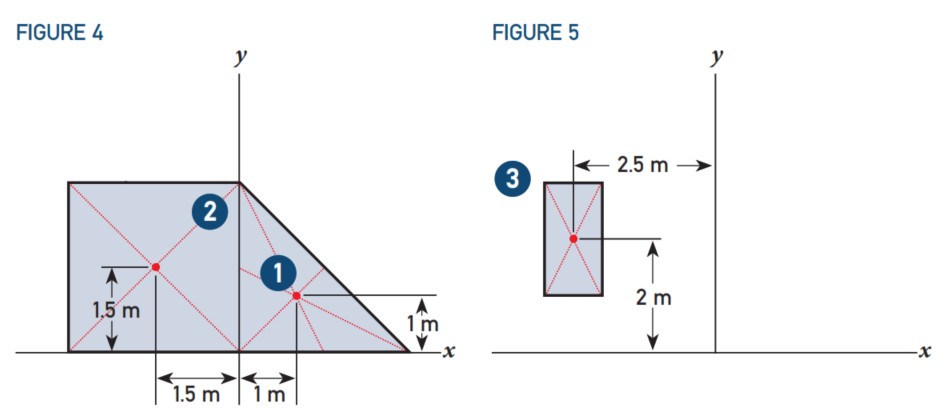 Dari masing-masing sub-objek ini, CoG harus ditentukan dan dinyatakan dalam koordinat. Lihat gambar 4 dan 5. Dengan menggambar garis bantu (dalam warna merah) dari satu sudut ke sudut yang berlawanan, CoG dapat ditemukan untuk kotak dan persegi panjang. Dengan menggambar garis (bantu) dari satu sudut ke tengah sisi yang berlawanan, CoG dapat ditemukan untuk segitiga. CoG ini ditemukan di persimpangan garis-garis bantu ini. Hasilnya adalah sebagai berikut:
