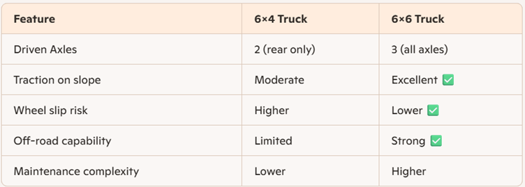 Hal ini memberikan traksi yang sangat baik di tanjakan dan risiko selip roda yang lebih rendah, serta kemampuan off-road yang lebih kuat. Namun, 6×6 memiliki kompleksitas perawatan yang lebih tinggi.