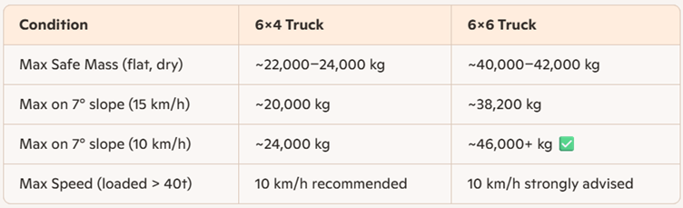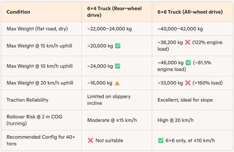 - Konfigurasi yang Direkomendasikan untuk >40 ton: Truk 6×4 tidak cocok, hanya 6×6 yang disarankan pada kecepatan ≤ 10 km/jam.