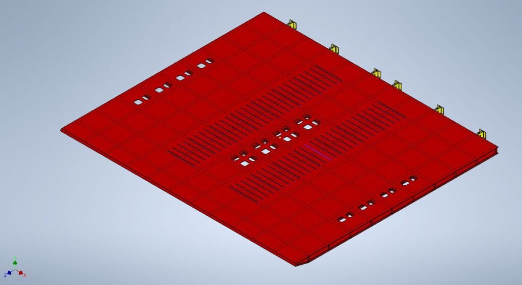 Fungsi pembebanan pada ramp door adalah untuk memastikan distribusi beban yang tepat saat kendaraan berat, seperti multi-axle trailer, melintasi ramp door tersebut. Pembebanan ini bertujuan untuk menganalisis bagaimana ramp door akan menahan tekanan dan gaya yang dihasilkan oleh beban cargo selama proses pemuatan dan pembongkaran.