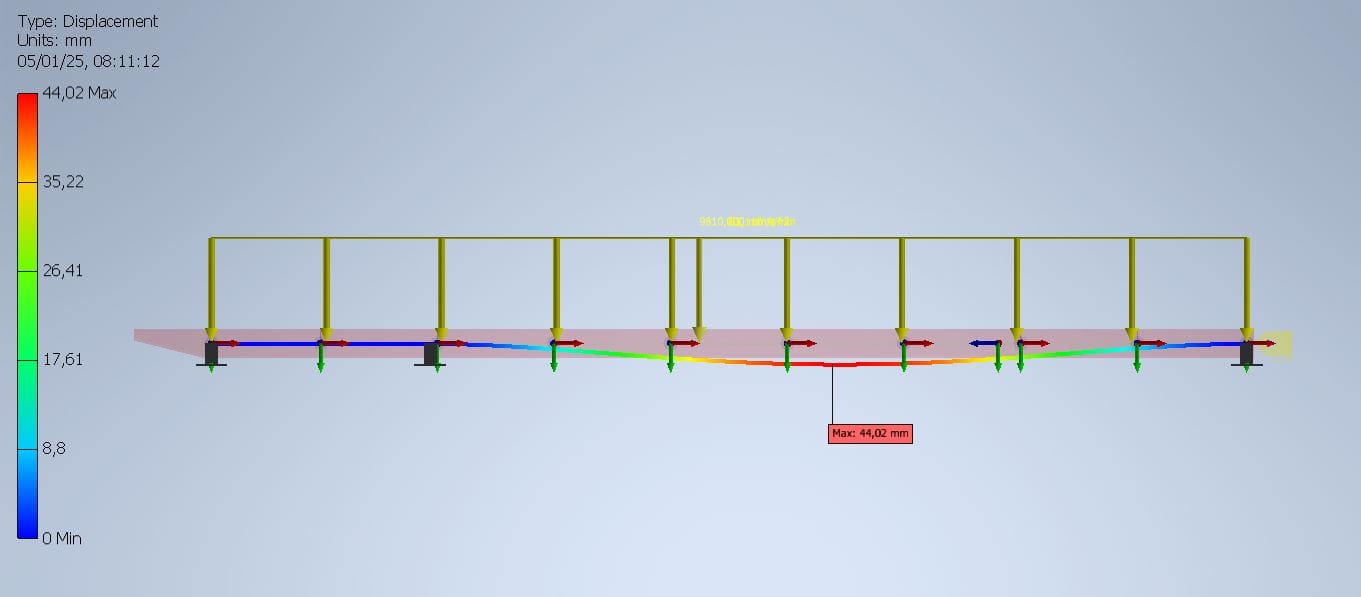 Dengan adanya kriteria yang dijinkan maka ada rujukan bahwa hasil simulasi pemodelan pada gambar diatas (dimana beban ditopang oleh masing masing engsel dan ujung ramp door) maka defleksi yang terjadi adalah 61.89mm. Hal ini melebihi dari kriteria yang diijinkan menurut AISC dimana L/200 = 48mm.