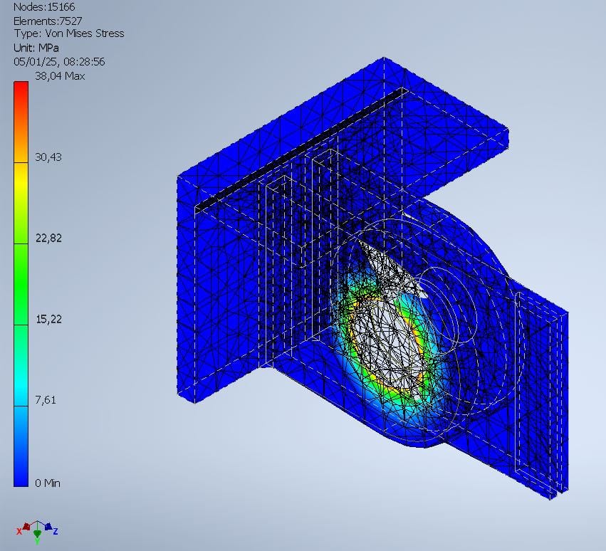 Dari simulasi model diatas didapatkan bahwa hasil von mises stress analisisnya adalah sebesar 38.04 MPa. Jika dibandingkan dengan kekuatan material yang dipakai (misalnya 207 MPa) maka rasio safety factornya cukup untuk kriteria aman.