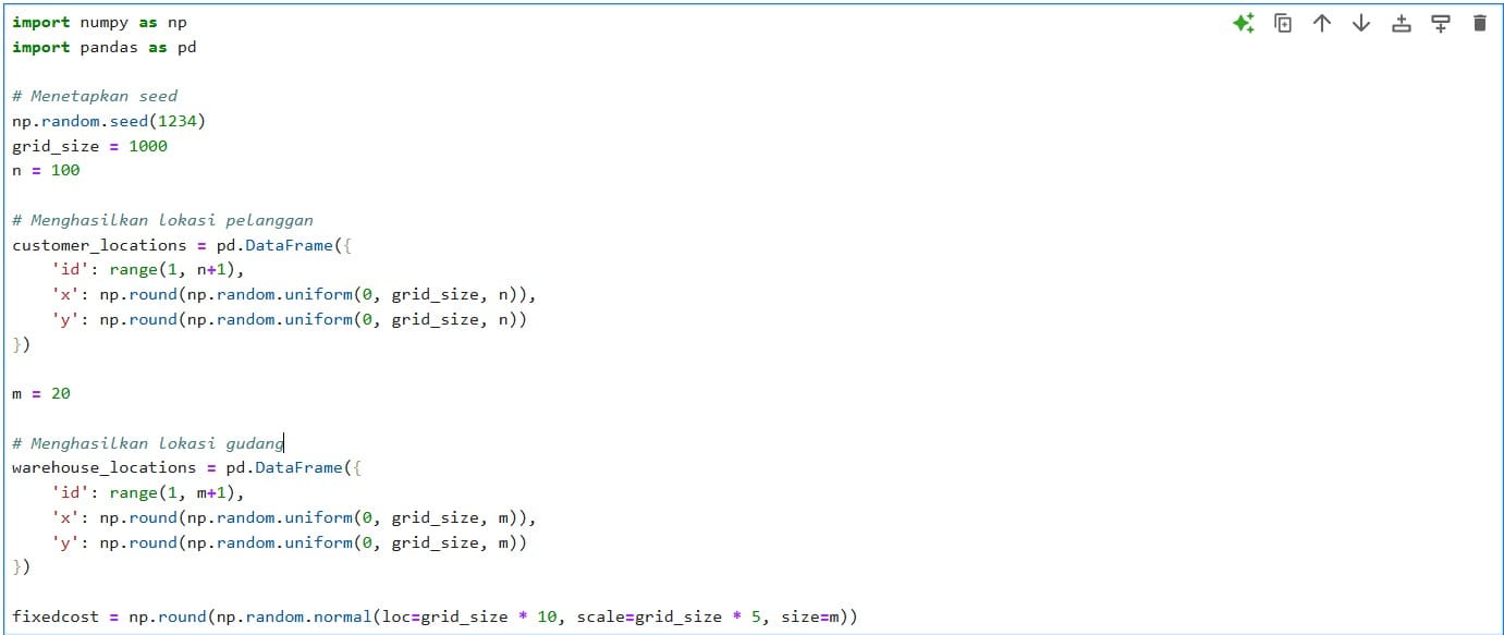 • Menghasilkan Lokasi Gudang: Lokasi gudang dihasilkan secara acak dalam grid dengan menggunakan np.random.uniform dan disimpan dalam dataframe warehouse_locations.
