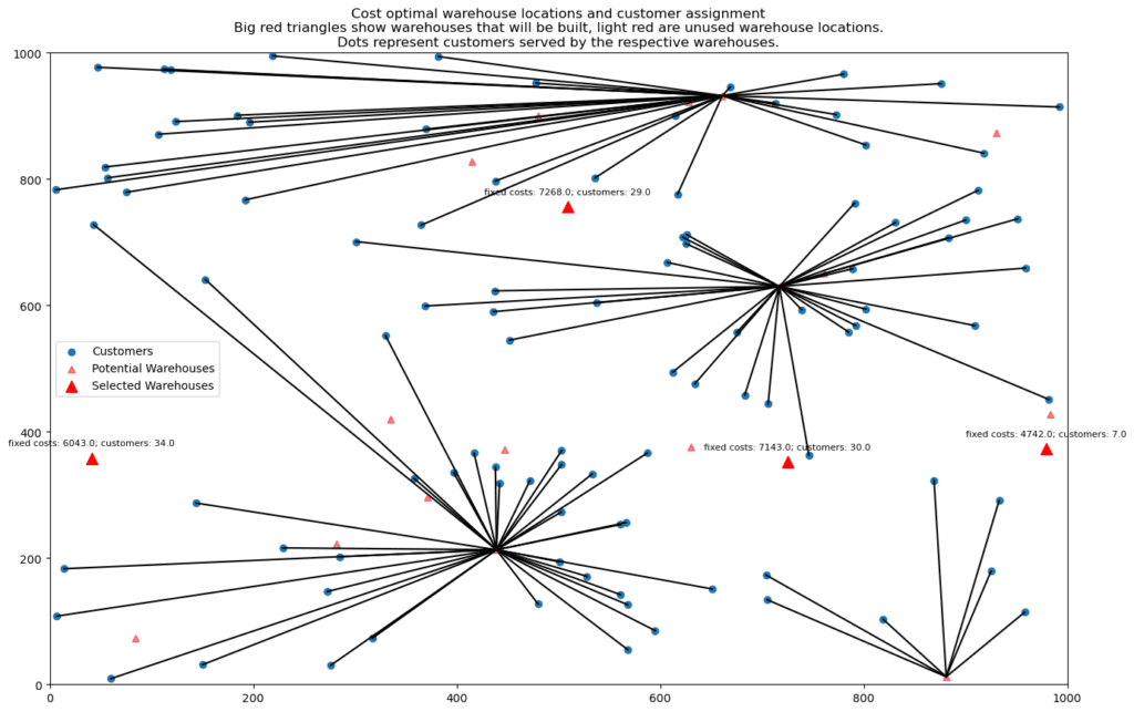 Dalam contoh di atas, batasan lpSum(y[j] for j in range(m)) == 4 memastikan bahwa tepat ada 4 gudang yang akan dibangun. Nilai ini dapat diubah menjadi 3 jika jika diinginkan tepat ada 3 gudang.