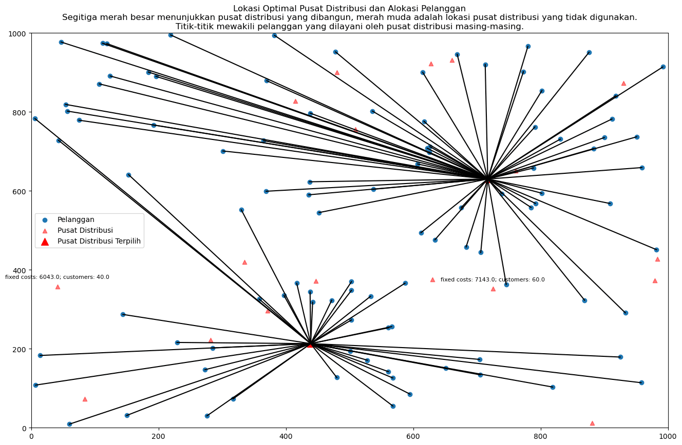• Menggambarkan hasil dalam plot visual untuk memvisualisasikan alokasi pelanggan ke gudang.