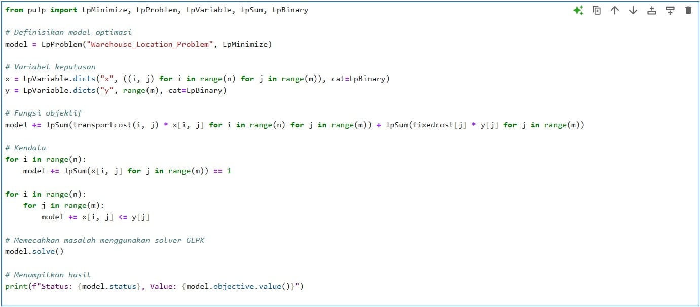 Berikut adalah kode untuk model optimasi yang digunakan untuk masalah lokasi gudang. Kode ini mendefinisikan model optimasi menggunakan perpustakaan PuLP di Python dan menyertakan fungsi objektif serta kendala: