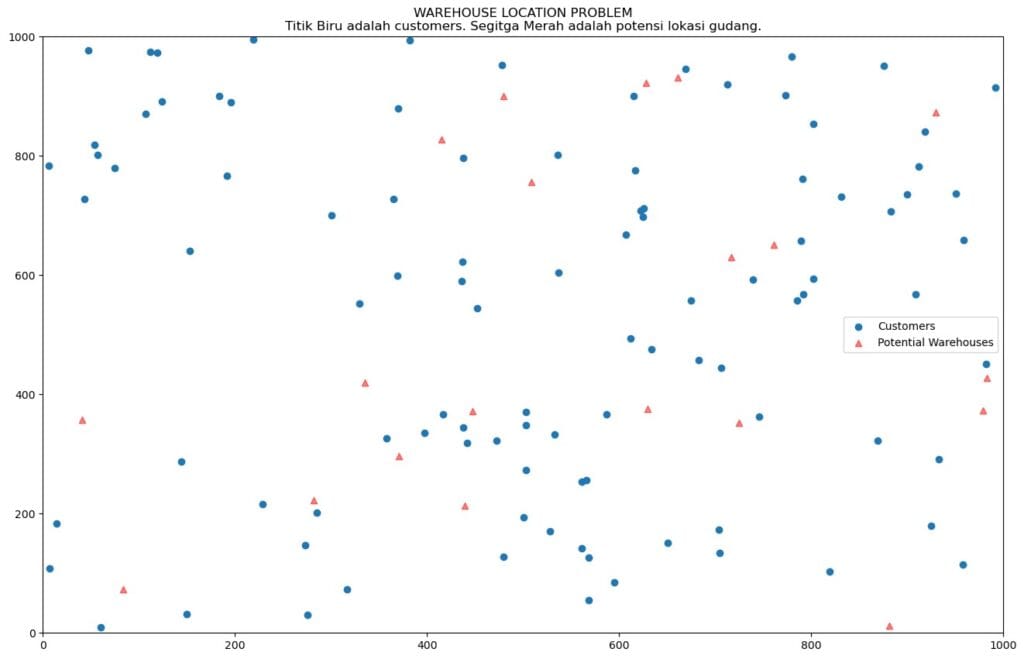 • Jumlah Gudang: m adalah 20, yang menentukan jumlah lokasi gudang potensial.