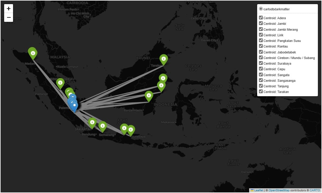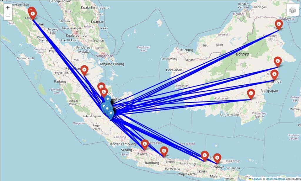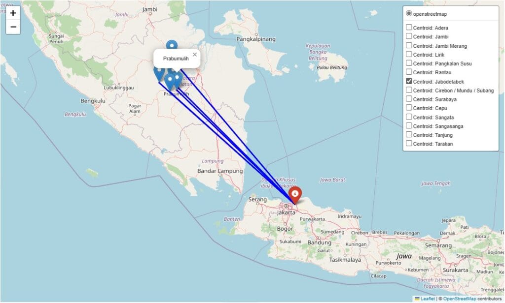 Dengan menggunakan pustaka Folium, peta interaktif dapat menampilkan titik-titik tempat pengambilan dan pengiriman barang di wilayah misalnya pulau Jawa, Sumatera, dan Kalimantan. Setiap titik pada peta akan dikelompokkan ke dalam beberapa layer berbeda berdasarkan jenis aktivitasnya, misalnya layer pengambilan barang dan layer pengiriman barang untuk cluster tertentu. Penggunaan layer ini memungkinkan visualisasi yang lebih jelas dan terstruktur, sehingga memudahkan dalam mengidentifikasi lokasi-lokasi strategis untuk operasional logistik.