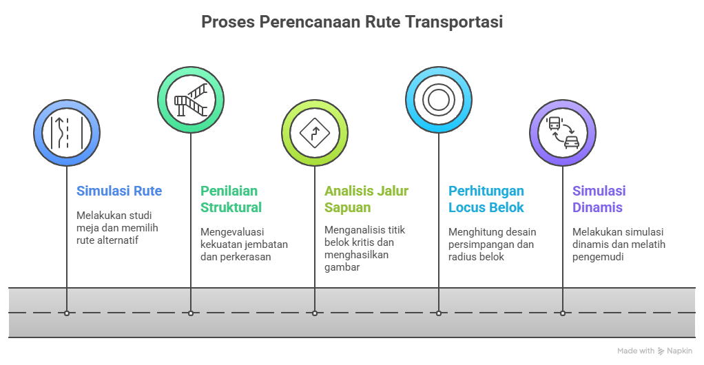 Route simulation adalah proses komprehensif untuk menganalisis seluruh koridor transportasi dari titik origin hingga destination. Ini merupakan tahap paling awal dan strategis dalam perencanaan transportasi ODC.