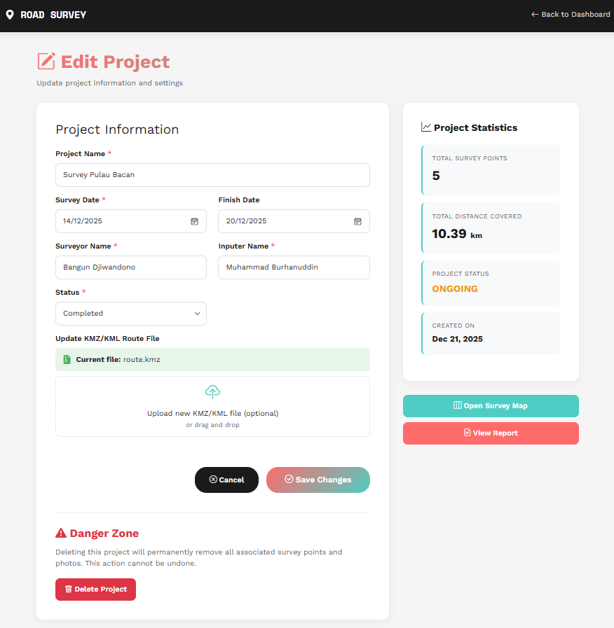 Dalam hal edit dan delete data, sistem memberikan fleksibilitas penuh kepada pengguna untuk memperbarui data survey point baik langsung dari peta maupun melalui tabel laporan. Seluruh field dapat diperbarui kecuali koordinat GPS, termasuk penggantian foto dengan mekanisme penghapusan otomatis file lama. Penghapusan data juga dilengkapi dengan konfirmasi, pembersihan foto secara otomatis, serta dukungan penghapusan beberapa titik sekaligus melalui seleksi checkbox.