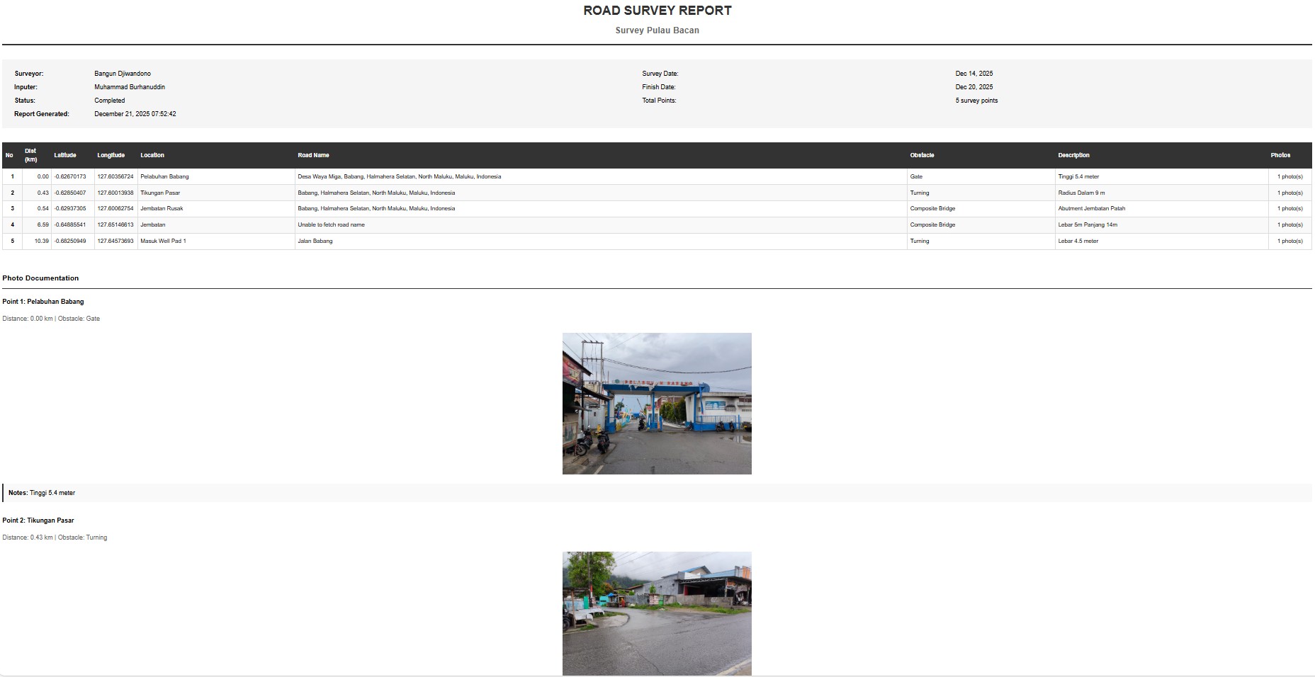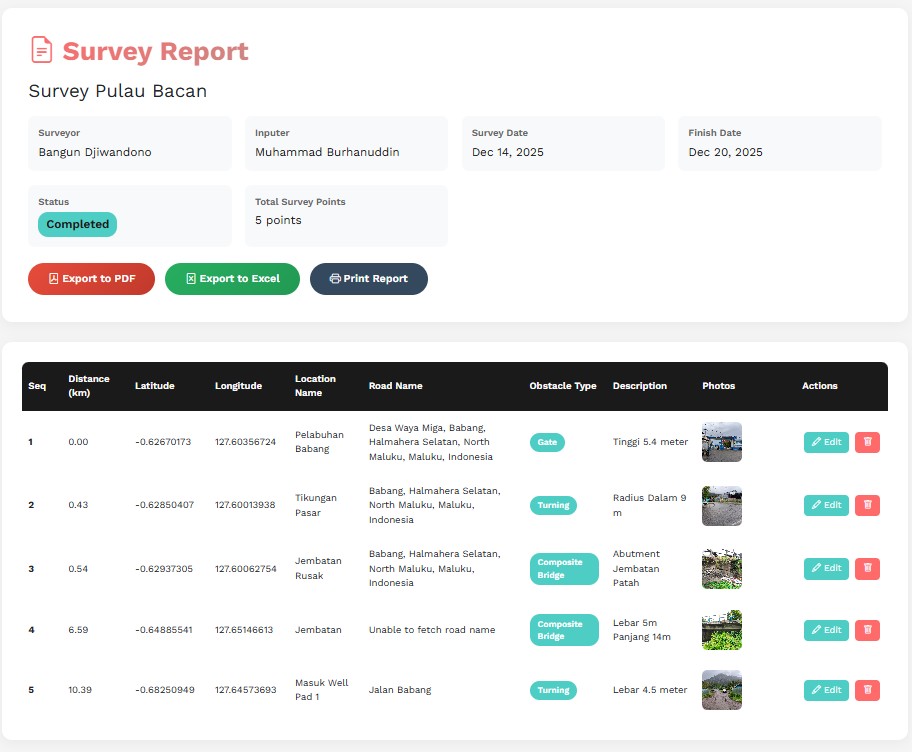 Sistem ini juga menyediakan fitur generate report dalam bentuk laporan HTML yang menampilkan seluruh titik survei dalam format tabel lengkap dengan nomor urut, koordinat, lokasi, jenis hambatan, deskripsi, dan thumbnail foto. Laporan dilengkapi dengan kolom yang dapat diurutkan, galeri foto dengan efek lightbox, statistik ringkas seperti total titik, total jarak, dan distribusi hambatan per kategori, serta tampilan yang ramah untuk kebutuhan cetak.