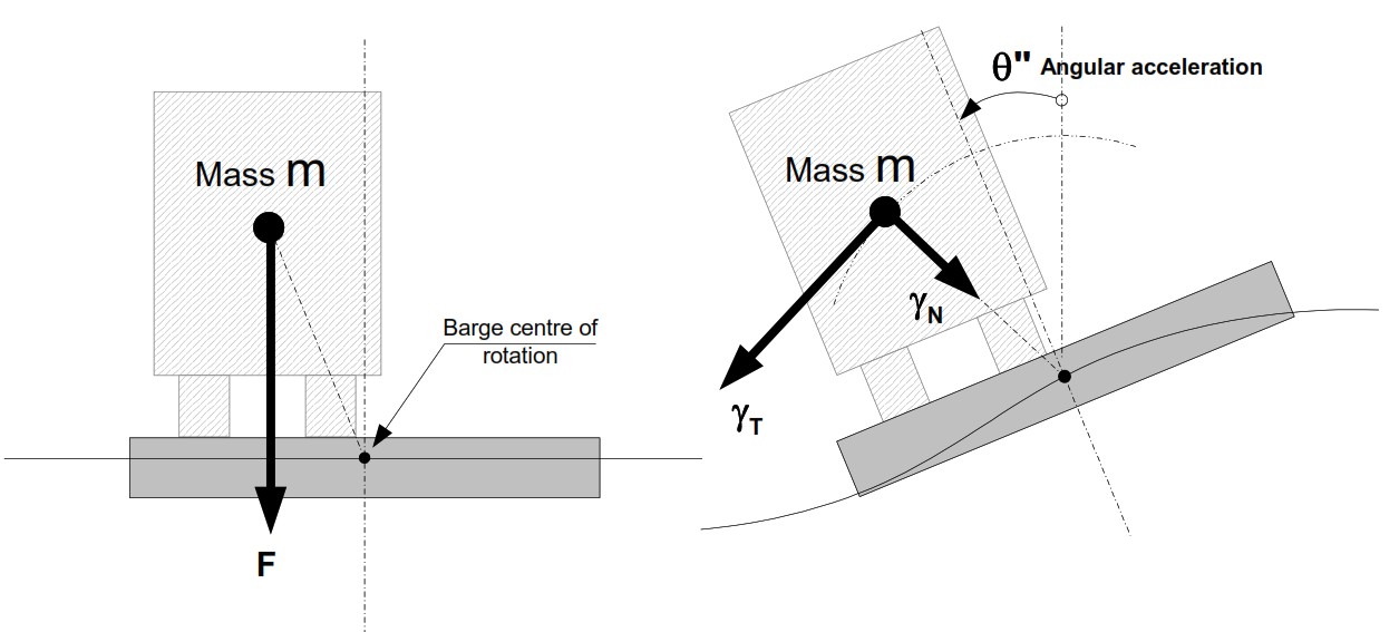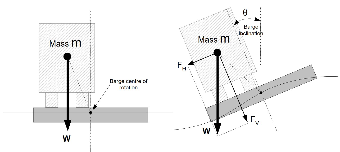 Ketika tongkang mengalami inklinasi akibat rolling atau pitching, massa struktur yang berada di atas tongkang akan mengalami perpindahan komponen gaya. Gaya berat (W = mg) yang awalnya vertikal akan terdekomposisi menjadi komponen sejajar dan tegak lurus terhadap permukaan tongkang yang miring.