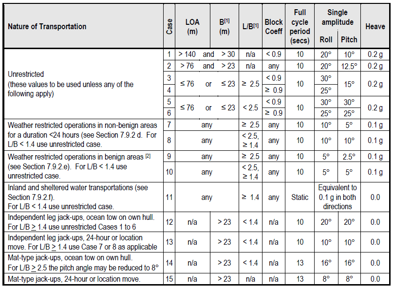 Untuk objek yang ditarik seperti FPSO, yang mungkin memiliki modul yang terpasang secara permanen dengan pipa atau sambungan lainnya, fleksibilitas yang memadai dalam sambungan sangat penting untuk menghindari tegangan berlebih. Penting untuk dicatat bahwa kondisi pembengkokan gelombang transportasi bisa lebih parah daripada kondisi operasi. Pipa internal dalam modul panjang yang dibawa sebagai kargo juga harus dipertimbangkan.