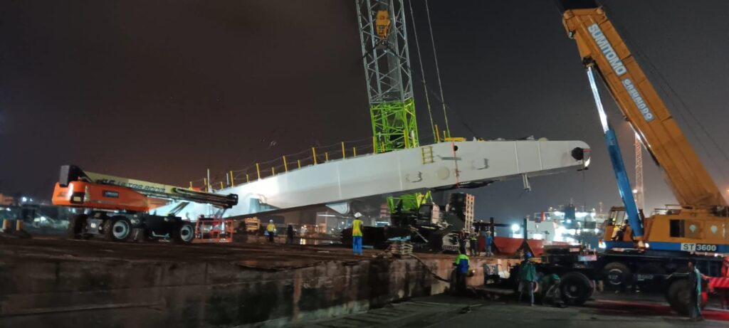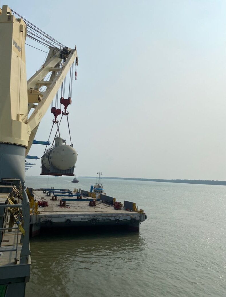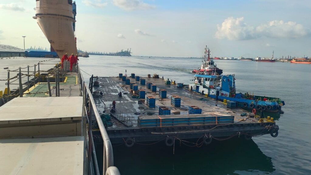 Sebelum operasi dimulai, tim teknis melakukan verifikasi menyeluruh pada kapasitas angkat crane kapal dan kekuatan deck barge. Verifikasi tersebut meliputi safe working load (SWL) crane, radius operasional, dan posisi boom untuk memastikan beban heavy cargo dapat terangkat tanpa melewati batas load chart crane. Contohnya, jika crane memiliki SWL 200 ton pada outreach 20 meter, tim memastikan beban kargo seperti generator 150 ton akan berada dalam range aman ketika boom diposisikan pada sudut optimal.