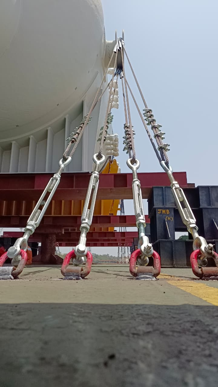 Dokumen ini juga menggambarkan posisi dan arah lashing, serta setting tension awal—biasanya 10 % SWL—dan prosedur re-tension setiap 24 jam. Ilustrasi rigging pada transformator akan menunjukkan shackles pada pad eyes dan arah tarikan yang membentuk sudut 45° terhadap centerline kargo.