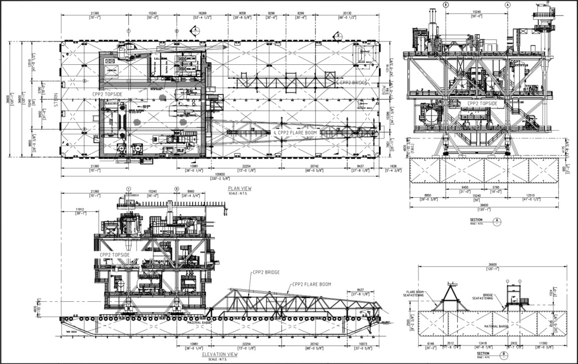 CPP2 Deck dimuat ke barge transportasi menggunakan metode skidding. Dua set skid beam diletakkan di atas flat top barge dan dua set link bridge dipasang pada pin tepi jetty untuk memberikan transisi yang mulus selama pergerakan skid shoe. Sistem penarik menggunakan winch digunakan untuk menarik deck ke posisi akhir di atas barge. CPP2 Deck ditopang oleh 4 skid shoe yang ditempatkan di sepanjang ROW-A dan ROW-B.