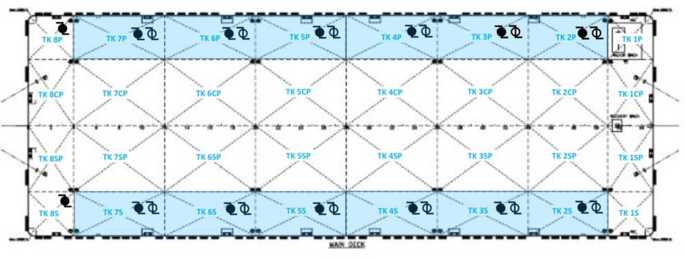 Penomoran tangki dimulai dari haluan (bow), yaitu TK 1 hingga TK 8, dengan penamaan sisi: -P (port), -CP (center port), -CS (center starboard), dan -S (starboard). Elevasi jetty di atas puncak beton di yard Fabricators yang digunakan dalam perhitungan adalah +2,08 m di atas Chart Datum.