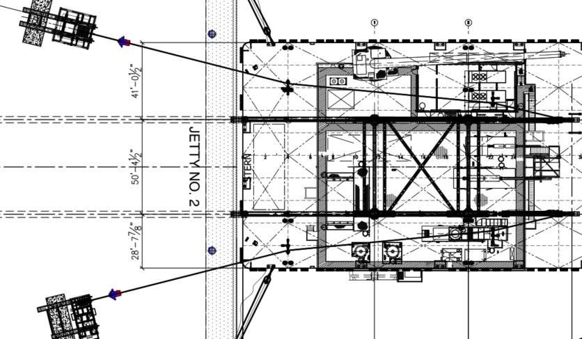 Yang kedua adalah Deadman 1 yang terlihat pada gambar penampang (section drawings), terletak di sisi haluan (bow) barge sebagai titik tambat di sisi jauh dari jetty. Prinsipnya adalah deadman harus cukup berat dan kuat sehingga tidak bergeser ketika tali mooring menariknya. Semakin besar barge dan beban operasi, semakin besar pula deadman yang diperlukan.