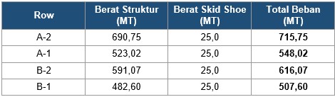 Beban pada setiap skid shoe CPP2 Deck diambil dari hasil penimbangan terbaru oleh F abricators, dengan penambahan berat skid shoe dan skid frame. Distribusi beban pada masing-masing skid shoe ditunjukkan pada tabel berikut: