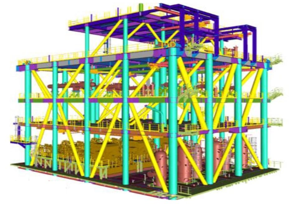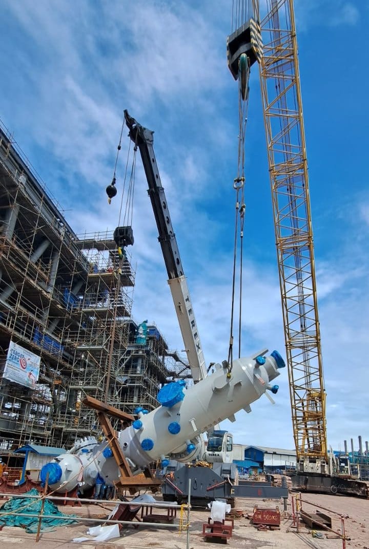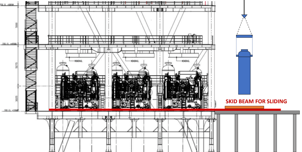 Dalam kasus ini adalah 6 unit pressure vessel harus dipasang didalam module seperti gambar diatas, sedangkan modul sudah hampir jadi sehingga perlu dilakukan penggeseran setelah pressure vessel tersebut diangkat dan ditempatkan di temporary support seperti gambar dibawah ini.
