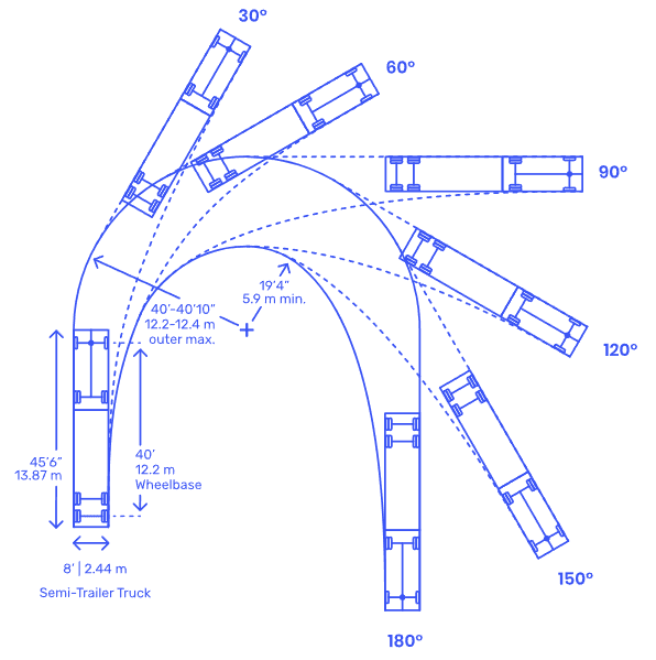 Berikut adalah contoh swept path untuk lintasan putar Truk Semi Trailer dengan ukuran 40′ dimana radius putar minimum yang mungkin diperlukan untuk melakukan putaran balik pada kendaraan tersebut dengan jarak sumbu roda 12,2 m.