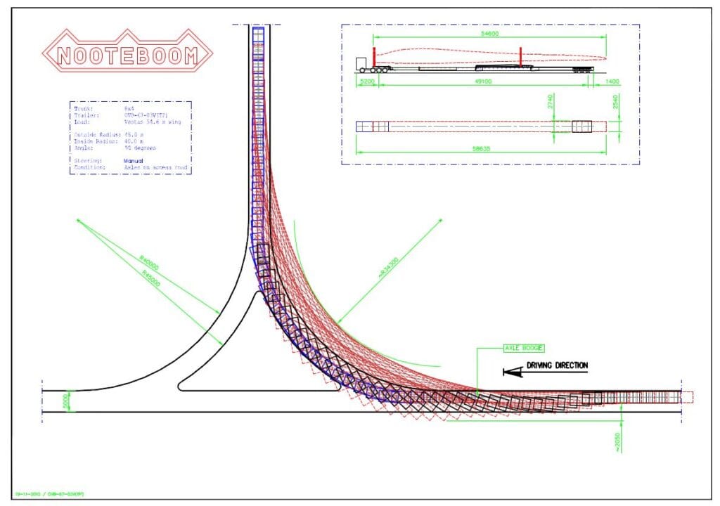 Pada Turning Locus terdapat gambar yang memperhitungkan pivot point, yaitu titik pusat belokan, yang sangat penting untuk kendaraan berukuran besar seperti multi-axle trailer atau SPMT. Hal ini nanti digunakan untuk memastikan kendaraan dapat melewati tikungan sempit, persimpangan, atau jalan dengan hambatan tertentu. Pada beberapa sisi jalan biasanya nanti akan dimintakan eveluasi infrastruktur seperti memastikan jalan, jembatan, atau tikungan tersebut mampu menahan beban dan OK dengan dimensi kendaraan tersebut.